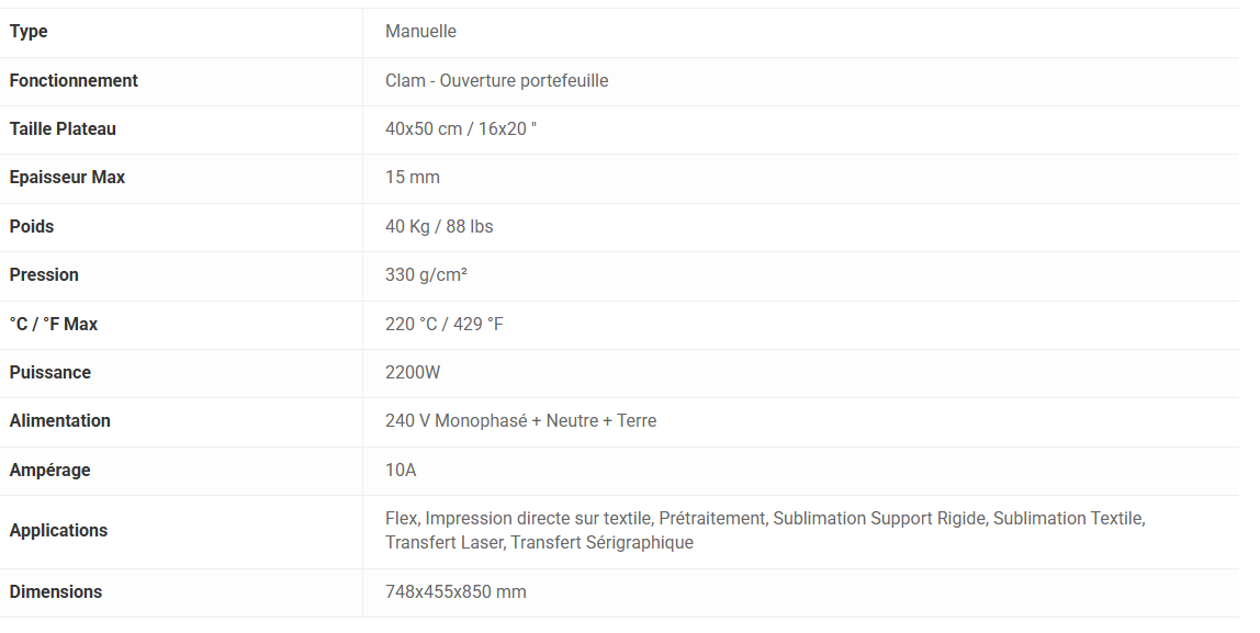 Cette presse électro-magnétique est le point d’entrée idéal chez SEFA. Fiable, simple d’usage, conçue en France. Plateau de 40 × 50 cm, pression 330 g/cm², température jusqu’à 220 °C. Nombreuses applications : flex, sublimation textile ou rigide, transfert laser ou sérigraphique. Garantie 2 ans, éléments chauffants : 10 ans.